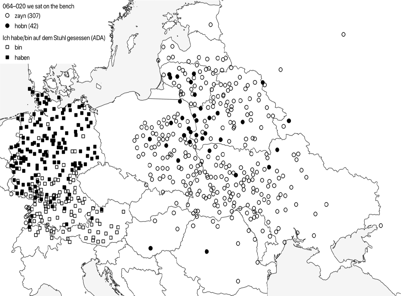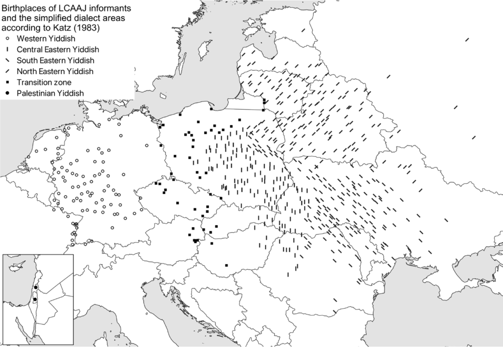 Eigenlijk is de bron die Schäfer gebruikte op zich al interessant: het Language and Culture Archive of Ashkenazic Jewry (LCAAJ) dat in de vroege jaren zestig werd opgebouwd door de bekende taalkundigen Uriel en Bina Weinreich. Zij interviewden sprekers van het Jiddisch uit een groot aantal plaatsen in Europa, zoals op bovenstaande kaart. De sprekers waren geboren aan het begin van de twintigste eeuw en omdat iemands taal na diens jeugd meestal niet meer zo snel verandert, krijgen we zo inzicht in het Jiddisch van voor de Holocaust. De geïnterviewden kregen een lange vragenlijst voorgelegd waarin 300 zinnen stonden die ze in hun eigen dialect moesten vertalen.