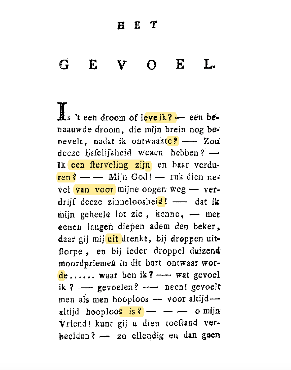Hoe zou je reageren als er in jouw mailbox een bericht binnenkwam, die als volgt begint: "Waar dwaal ik? – wat schrijf ik? – alles is verwarring, alles is afgrijzelijk om mij heen – talloze gedachten vliegen als stormwinden door mijn hoofd en mijn hart kan zich aan geen enkele binden"? Ik vrees dat 113 bellen dan de enige optie is... Bovenstaand fragment is een voorbeeld van de emotionele taal die Rhijnvis Feith gebruikte in zijn roman Julia, die in 1783 verscheen en een sensatie veroorzaakte in de Republiek der Zeven Verenigde Nederlanden. Feith introduceerde de sentimentele roman in Nederland, een genre dat draaide om de heftige gevoelens, verliefdheid, de obstakels en het lijden van twee jonge mensen: Eduard en Julia. Hij schreef in een stijl die men "writing to the moment" noemt, omdat hij de gevoelens van de personages beschreef op het moment dat ze werden gevoeld. Hij maakte ook gebruik van typografische experimenten, zoals gedachtestreepjes (—), uitroeptekens (!) en puntjes (…), om de intensiteit van de emoties te versterken.