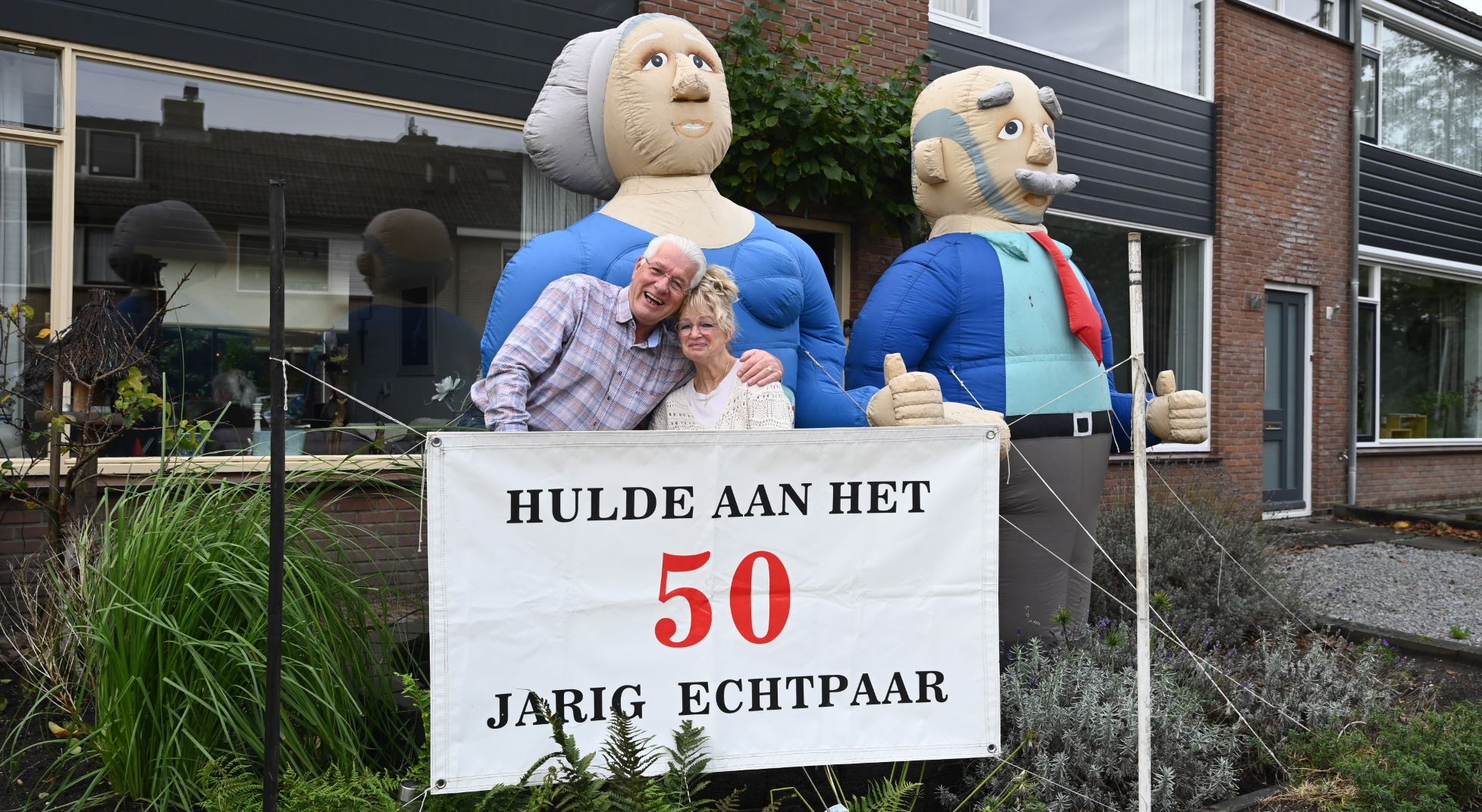 Het was woensdag 1 november groot feest in huize Gerritsma, want daar vierden Arjen en Dinie hun vijftigjarige huwelijksjubileum. Arjen is vooral bekend als collegafotograaf en grafisch vormgever en Dinie verricht als vrijwilliger veel werk voor het buurtcentrum Paashuis. Arjen en Dinie trouwden in Leeuwarden en vanwege het werk van Arjen verhuisden ze eind jaren tachtig naar Nijkerk waar ze neerstreken in de woonwijk Paasbos. En daar wonen ze nog steeds. En... ze zijn bovendien nog altijd stapelgek op elkaar. Vanmorgen heeft de familie twee poppen geplaatst en binnenkort volgt het feest. Foto Kees van den Heuvel