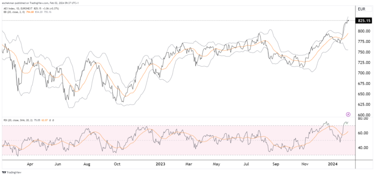 De AEX is vandaag met een winst van 0,5% op 826,23 weer dichter bij de high van 2021 gekomen van 827,57.