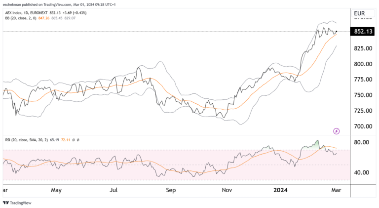 Het is dankzij de koerssprong van IMCD (+8,1% op het kwartaalbericht) dat de index hoger sloot. Het blijft echter een markt van vandaag winnen en morgen inleveren. NN plust gisteren maar moest vandaag in procenten een derde van de winst inleveren: -2,1% op 40,38 euro. Aegon is de sterkste daler vanwege het tegenvallende kwartaalresultaat.