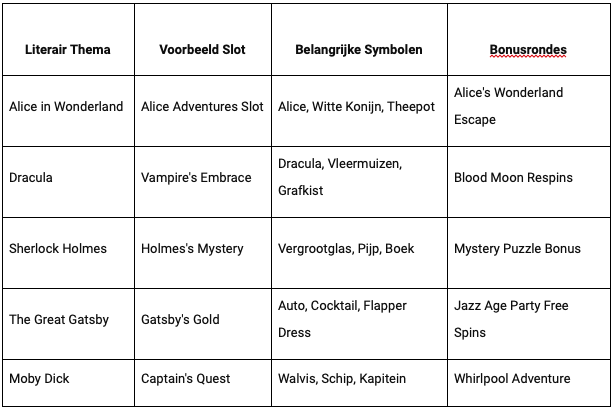 Deze tabel kan worden gebruikt om specifieke voorbeelden te bieden van hoe literatuur wordt omgezet in spelelementen, wat het gemakkelijker maakt voor lezers om de verbinding tussen boeken en slotontwerp te begrijpen: