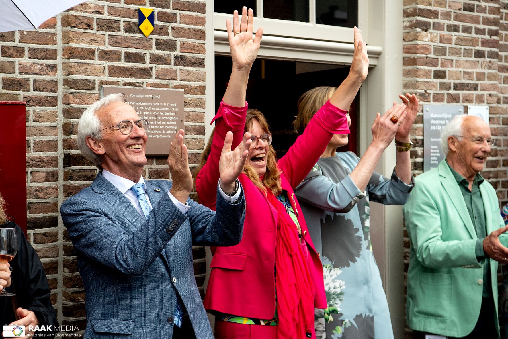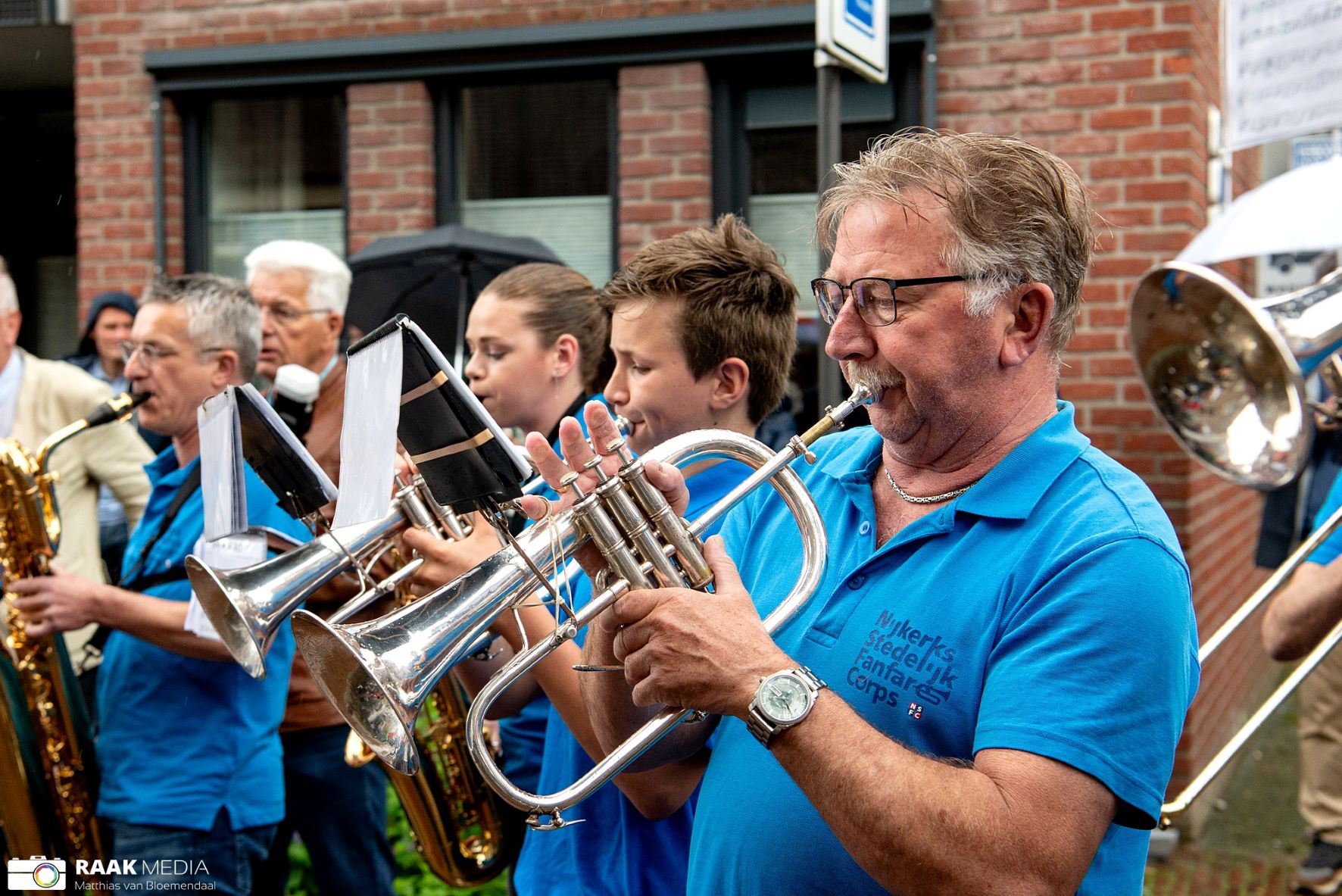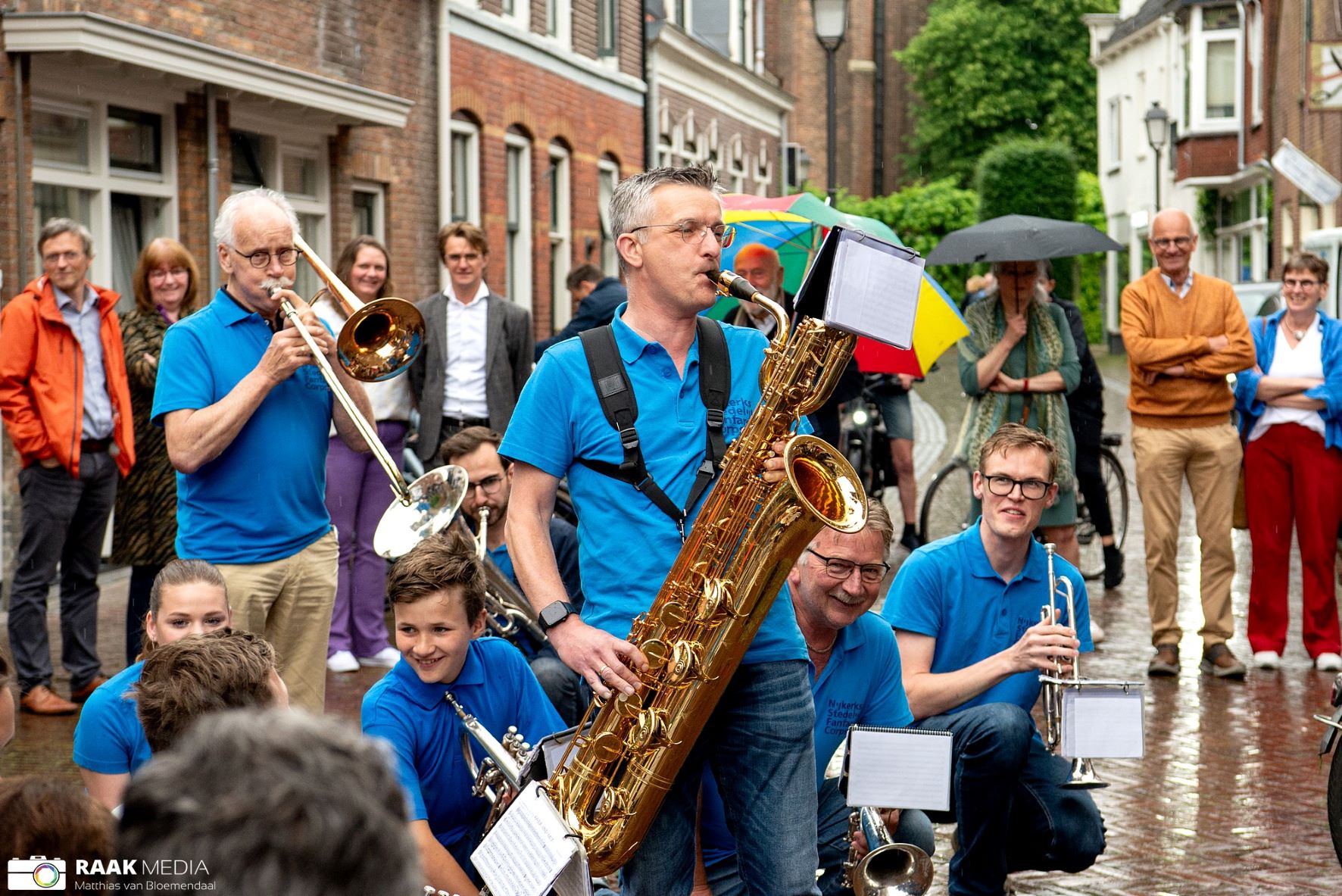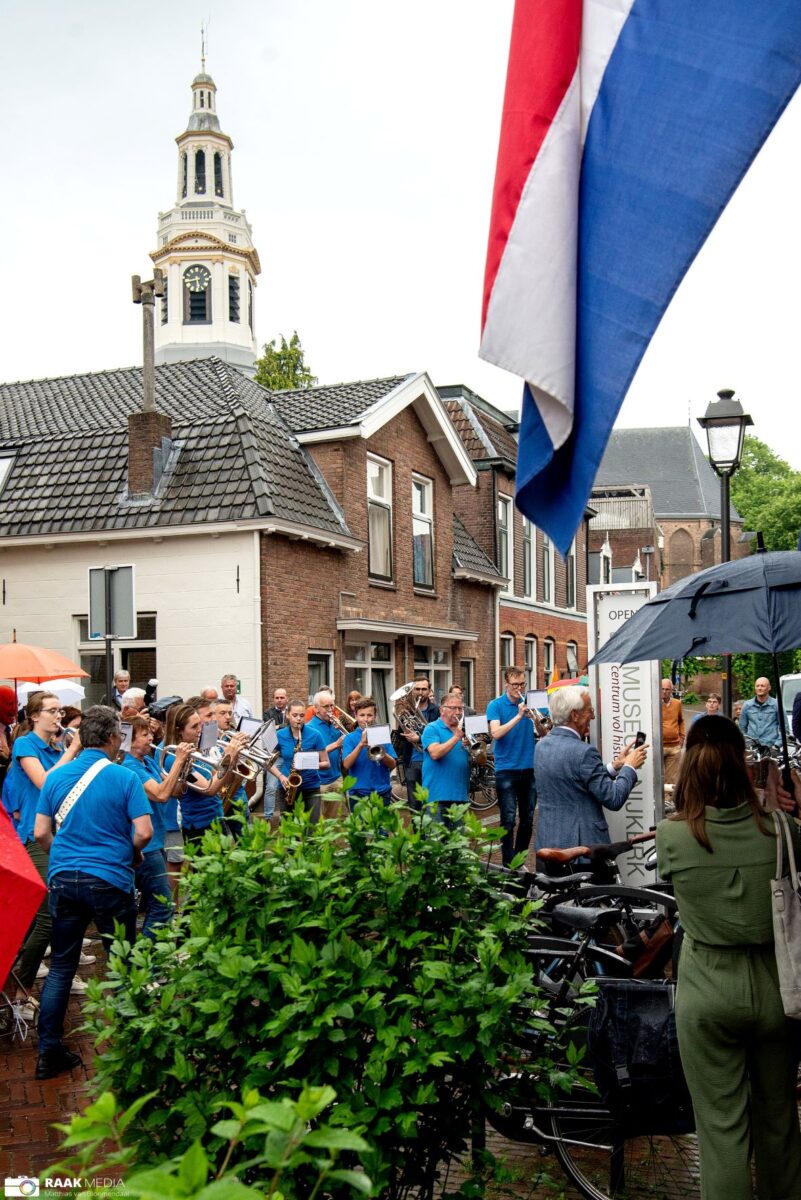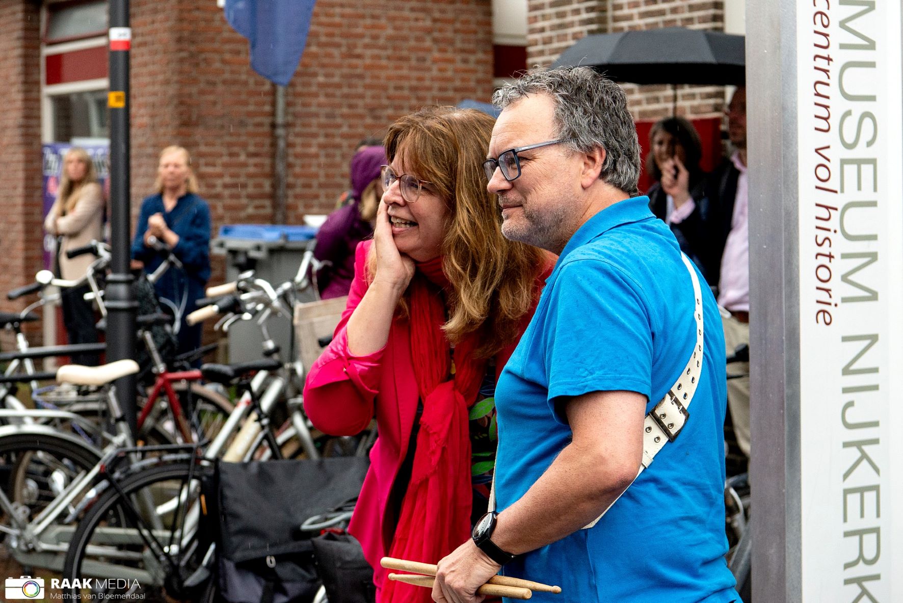 Bij haar afscheid als conservator van Museum Nijkerk is Saskia van den Berg verrast met een serenade van het Nijkerks Stedelijk Fanfare Corps (NSFC). Samen met opvolger Edith de Jong stond ze te dansen op de muzikale hulde. Eerder was ze al onderscheiden met de Erepenning in Zilver van de gemeente Nijkerk en uit handen van Baron Schimmelpenninck van der Oije ontving zij de Toon Martens van Sevenhoven penning. Foto Matthias van Bloemendaal / Raak Media