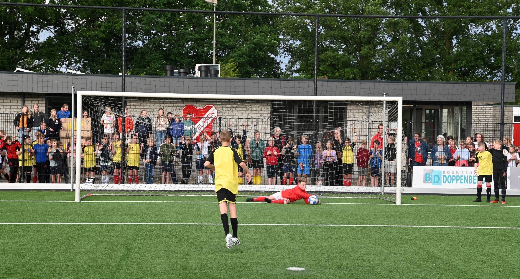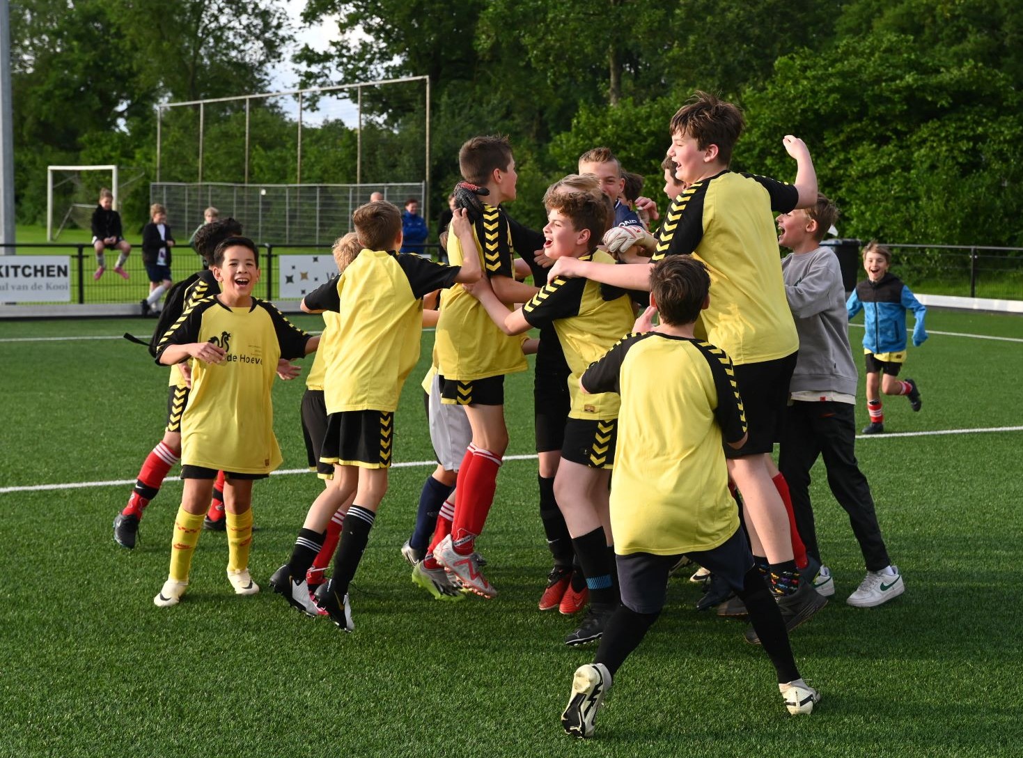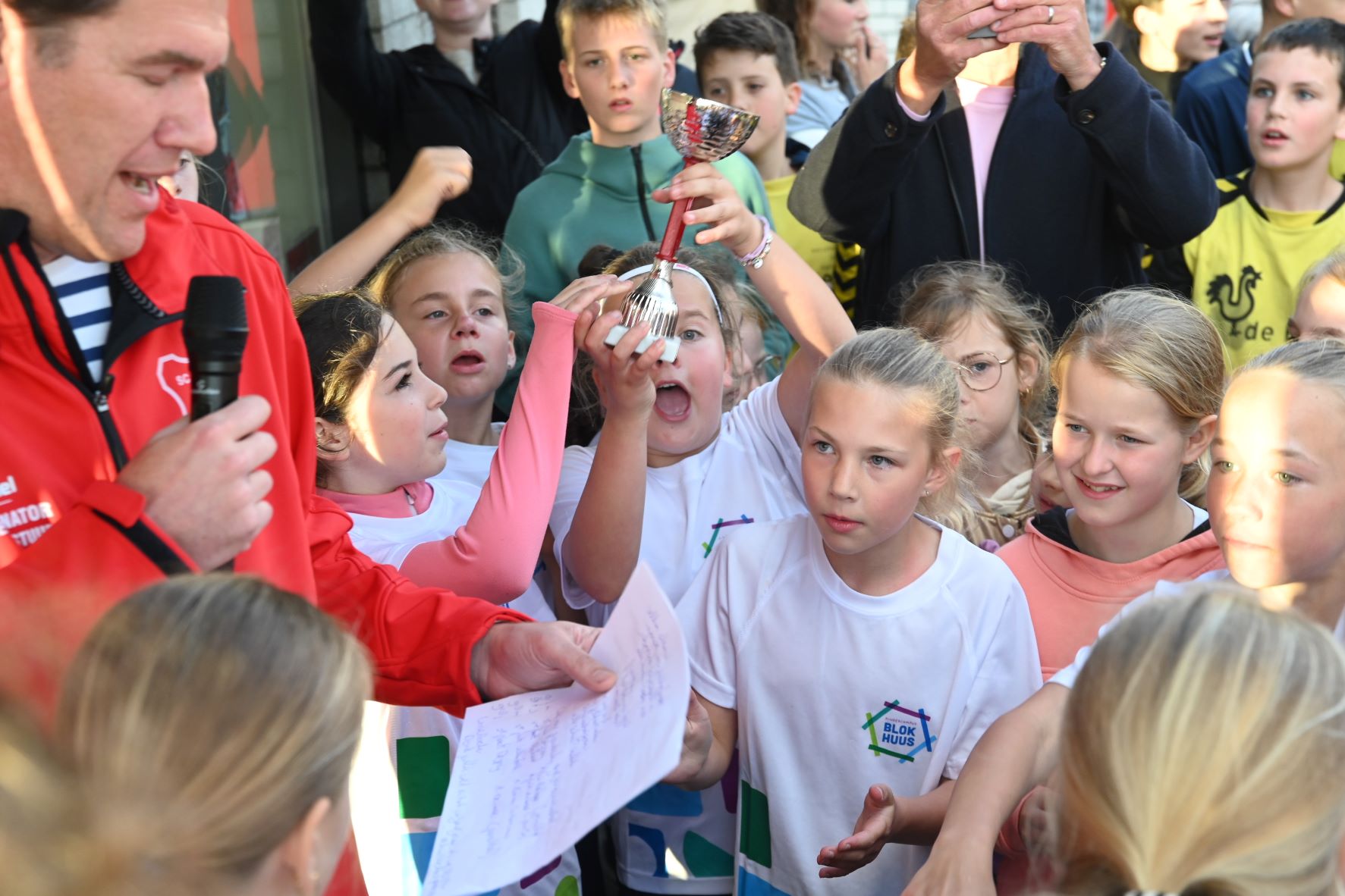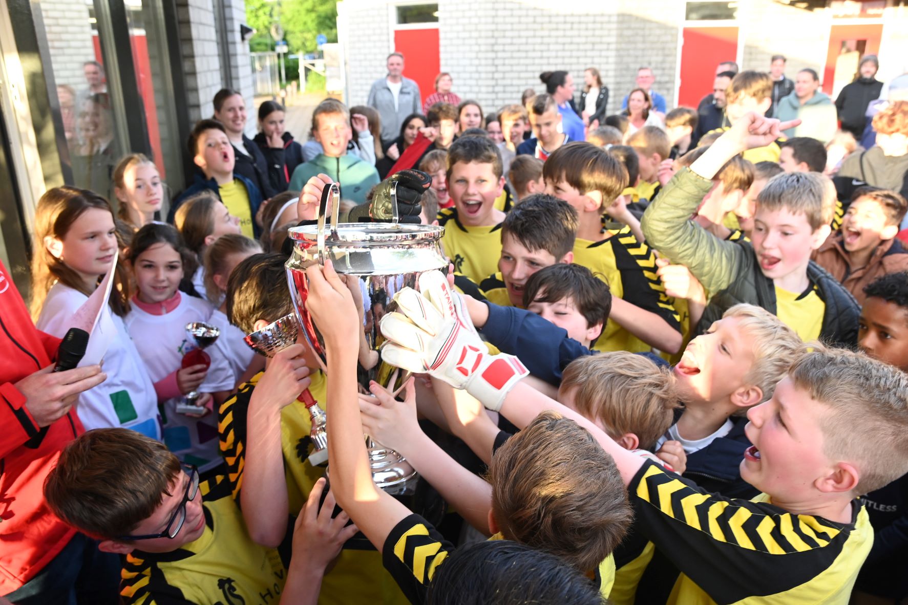 Vrijdagavond 31 mei werden de uitgestelde finales gespeeld om het kampioenschap van het schoolvoetbal Hoevelaken. Het leverde vier uitermate spannende finales op. De belangrijkste, die tussen de groepen 8 van de jongens van de Spreng en de Hoeve, eindigde in een overwinning voor de mannen van De Hoeve. Zij wisten de penalty's beter te benutten. De winnaars kregen de beker met de grote oren overhandigd door Daan Vinke, speler van het eerste team van Hoevelaken. Er waren eveneens penalty's nodig bij de finale meisjes voor de groepen 7 tussen De Spreng en het Blokhuus. De laatste school won uiteindelijk met 8-7. Bij de groepen 7 van de jongens won De Hoeve van Blokhuus. Verder was er nog een finale tussen de groepen 8 van de meisjes. Willem Farel werd hier tweede en winnaar werd Blokhuus. Foto en Kees van den Heuvel