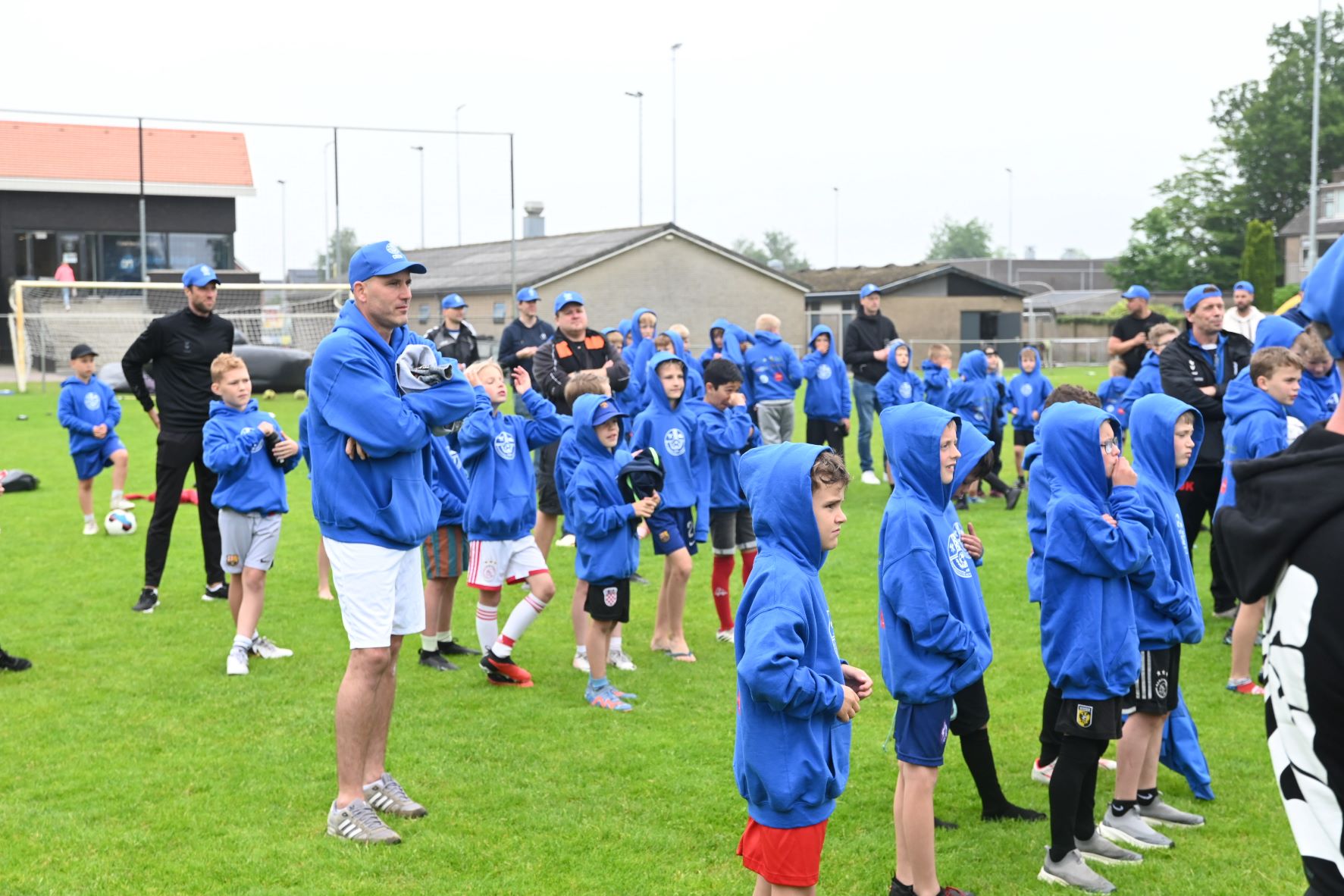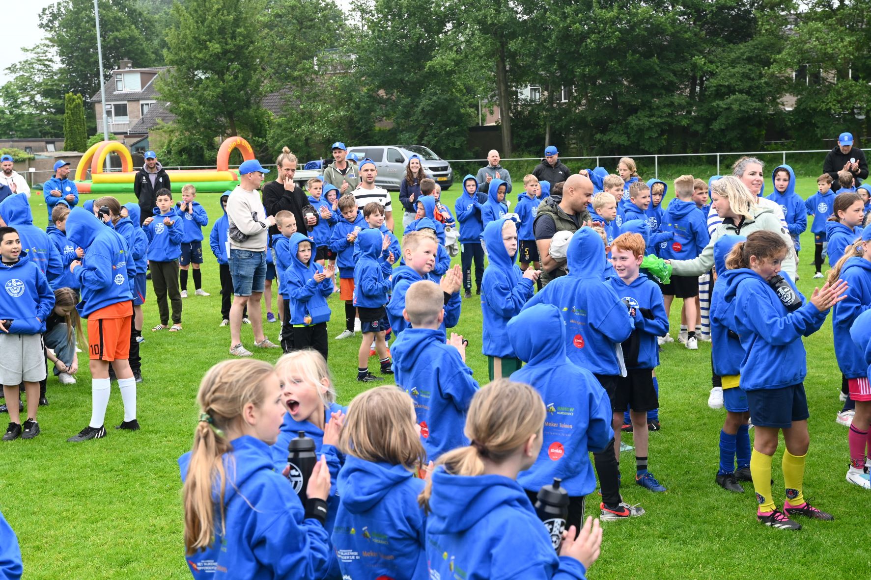 Alle jeugdleden van voetbalvereniging Veensche Boys hebben zaterdag 1 juni een blauwe hoodie ontvangen. Voor de jeugdleiders was er een blauwe pet. De blauwe zee aan hoodies werd op de foto vereeuwigd na afloop van de voetbalkamp. De hoodies zijn beschikbaar gesteld door Meker Tuinen, Bicycle Barn, BMWW Agriservice, Bonneveld, het Nijkerkse Kippeboertje en Edward de marktslager. Foto Kees van den Heuvel