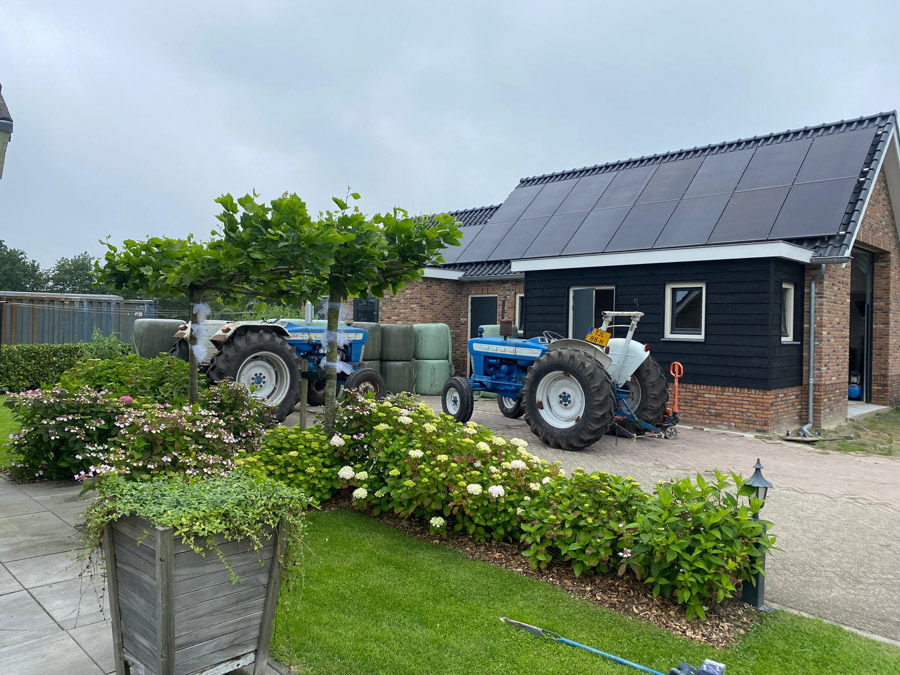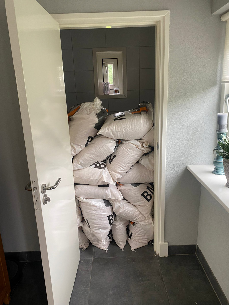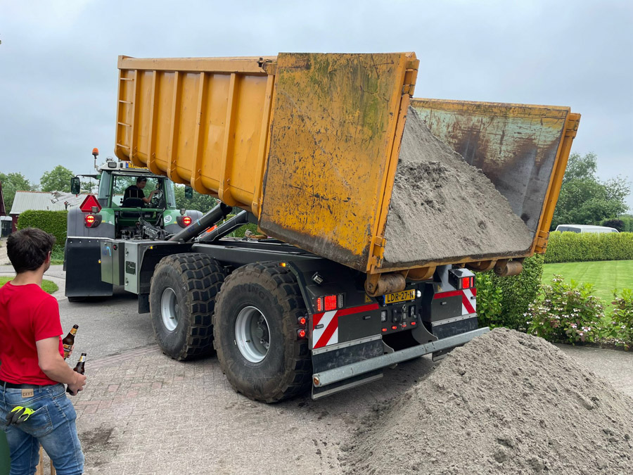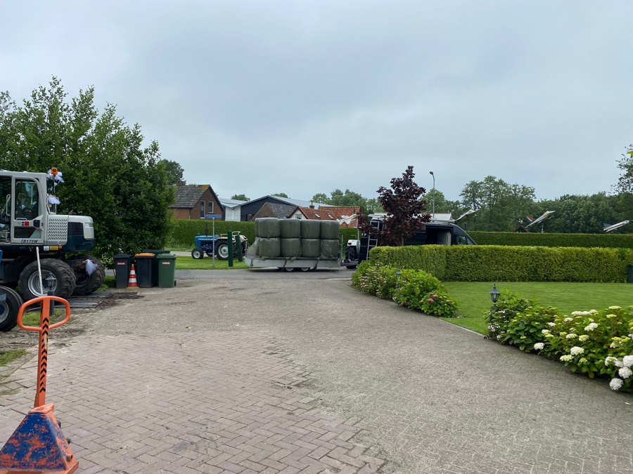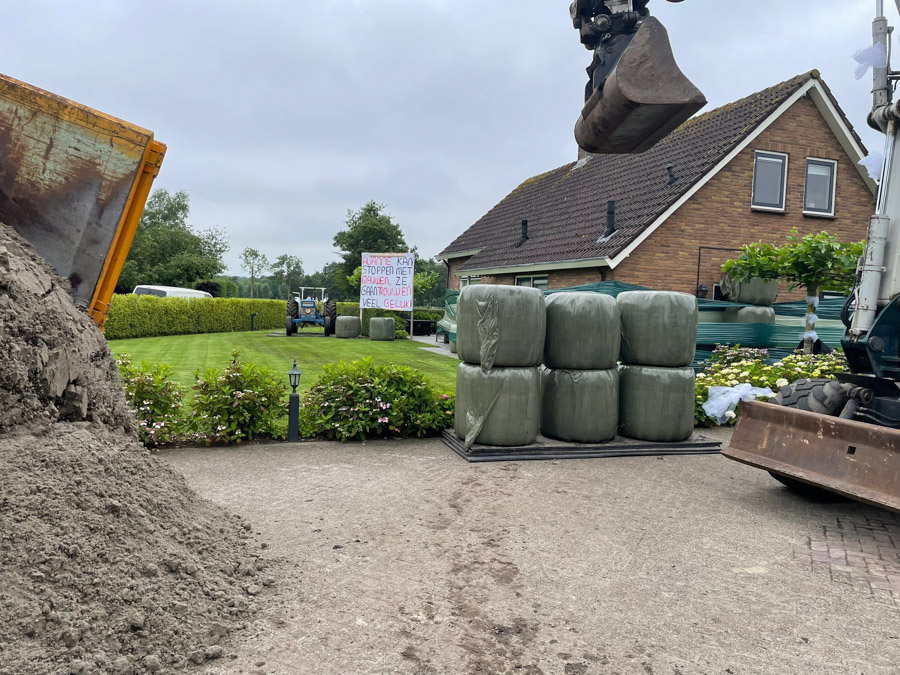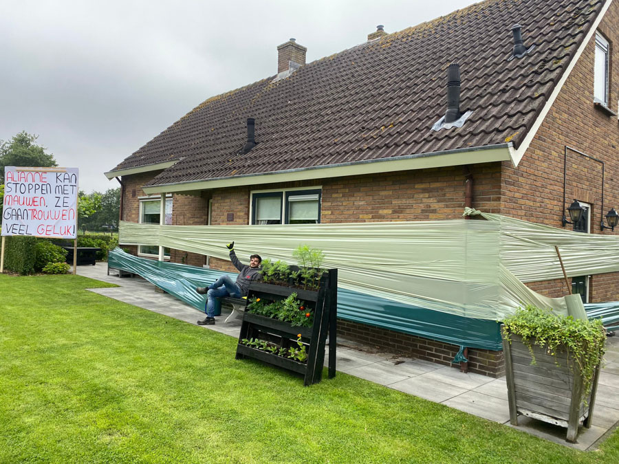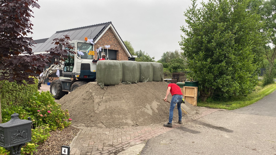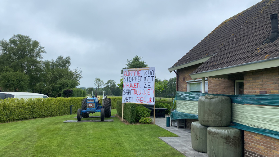 Een spandoek en trekker in de tuin.. Gelukkig hebben de vrienden met plaatsen wel om Mark zijn gras gedacht.. Verder was er een schutting gemaakt van hooibalen. En uiteraard zaten Mark en Alianne nog om zand verlegen voor het straatwerk en de vrienden zijn dan wel zo aardig om het bruidspaar daaraan te helpen. Voor de diverse dieren rondom huis zijn Mark en Alianne ook gek op het zaagsel van hout. Dit vonden zij in zakken in de badkamer. En ook een paar zakken in bed. Kortom het bruidspaar kan na een zeer geslaagde trouwdag, thuis verder met genieten.