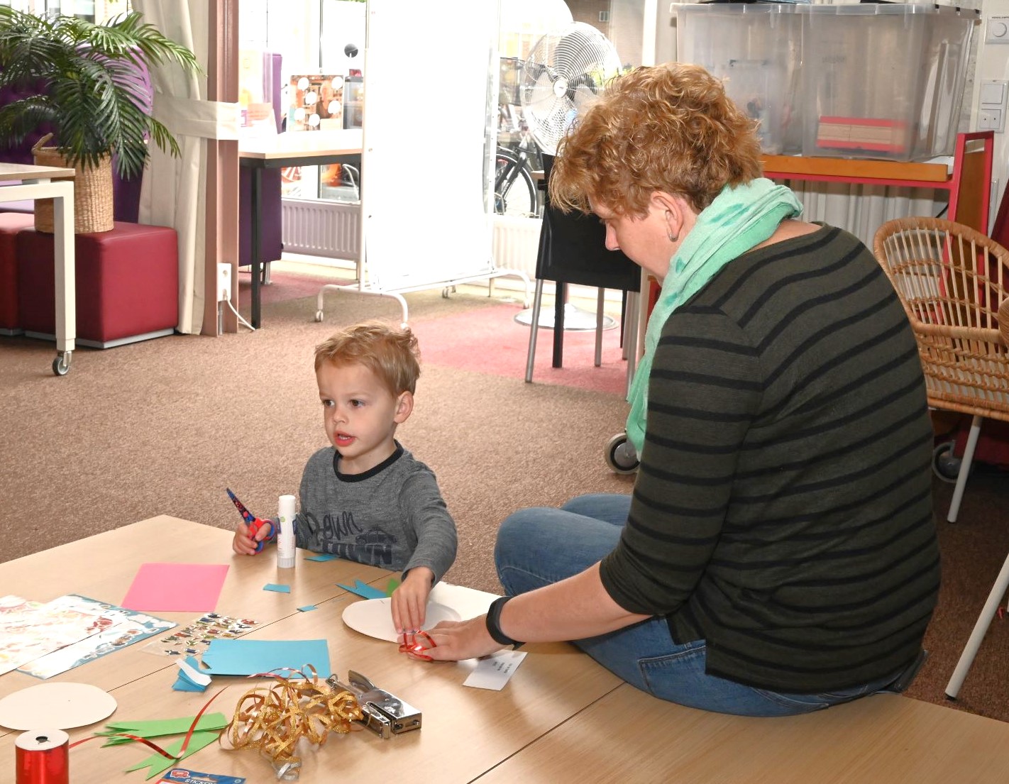 Alle Nijkerkse vaders moeten dit artikel even niet lezen, want er is een kleine kans dat tijdens Vaderdag een cadeau wordt aangeboden dat is gemaakt tijdens de peuterochtend in de bibliotheek van Nijkerk. De kinderen maakten maandagochtend 3 juni van papier en karton een medaille. Daarop komt uiteraard te staan dat hun vader de beste is van de hele wereld. Foto Kees van den Heuvel
