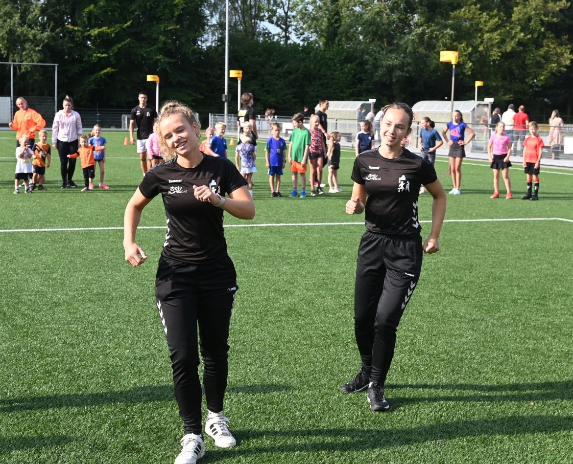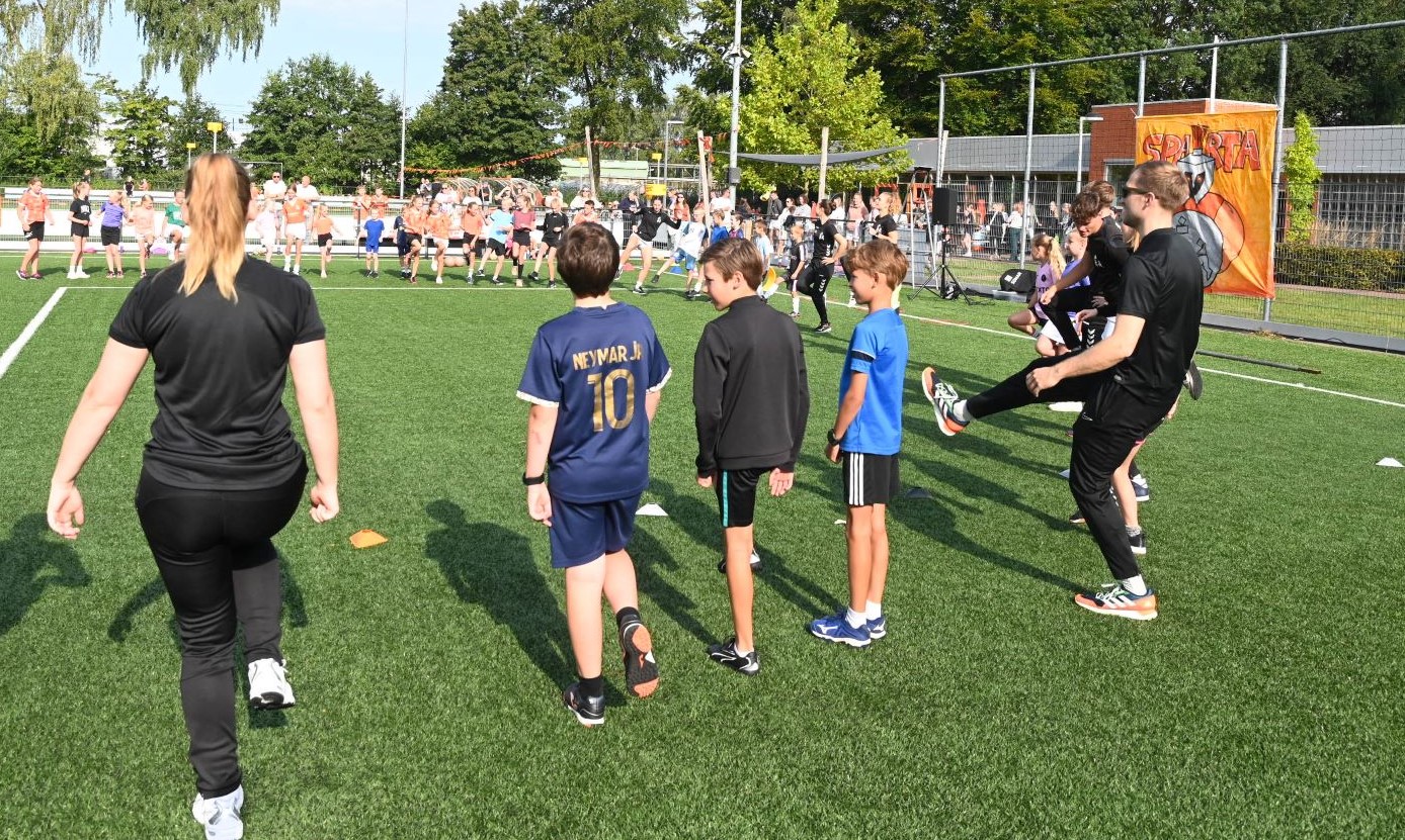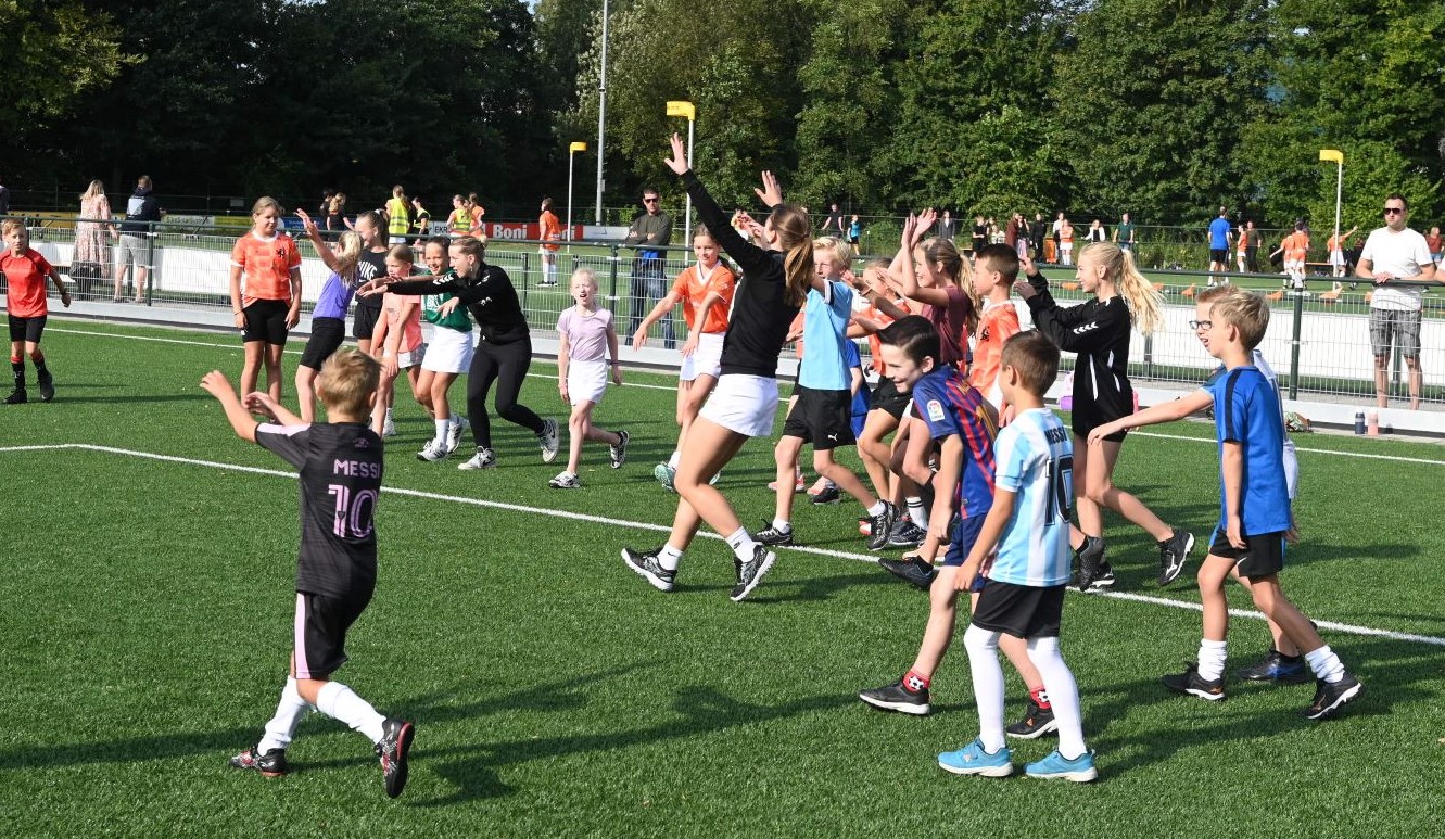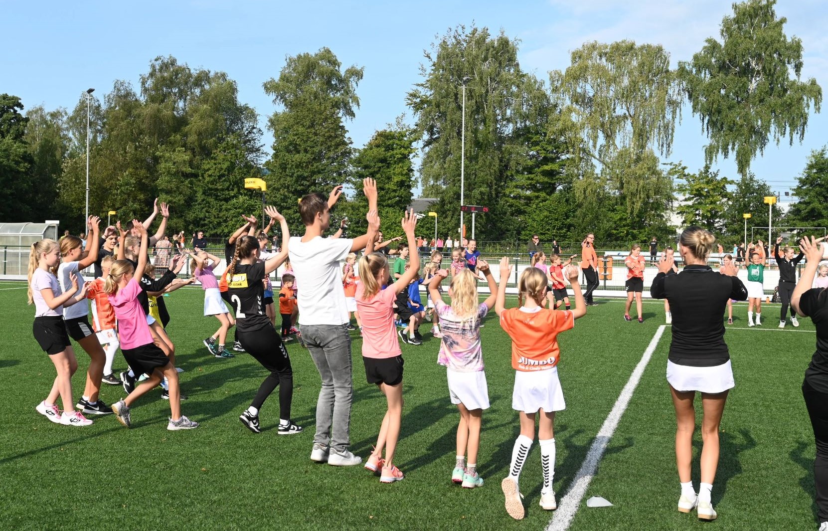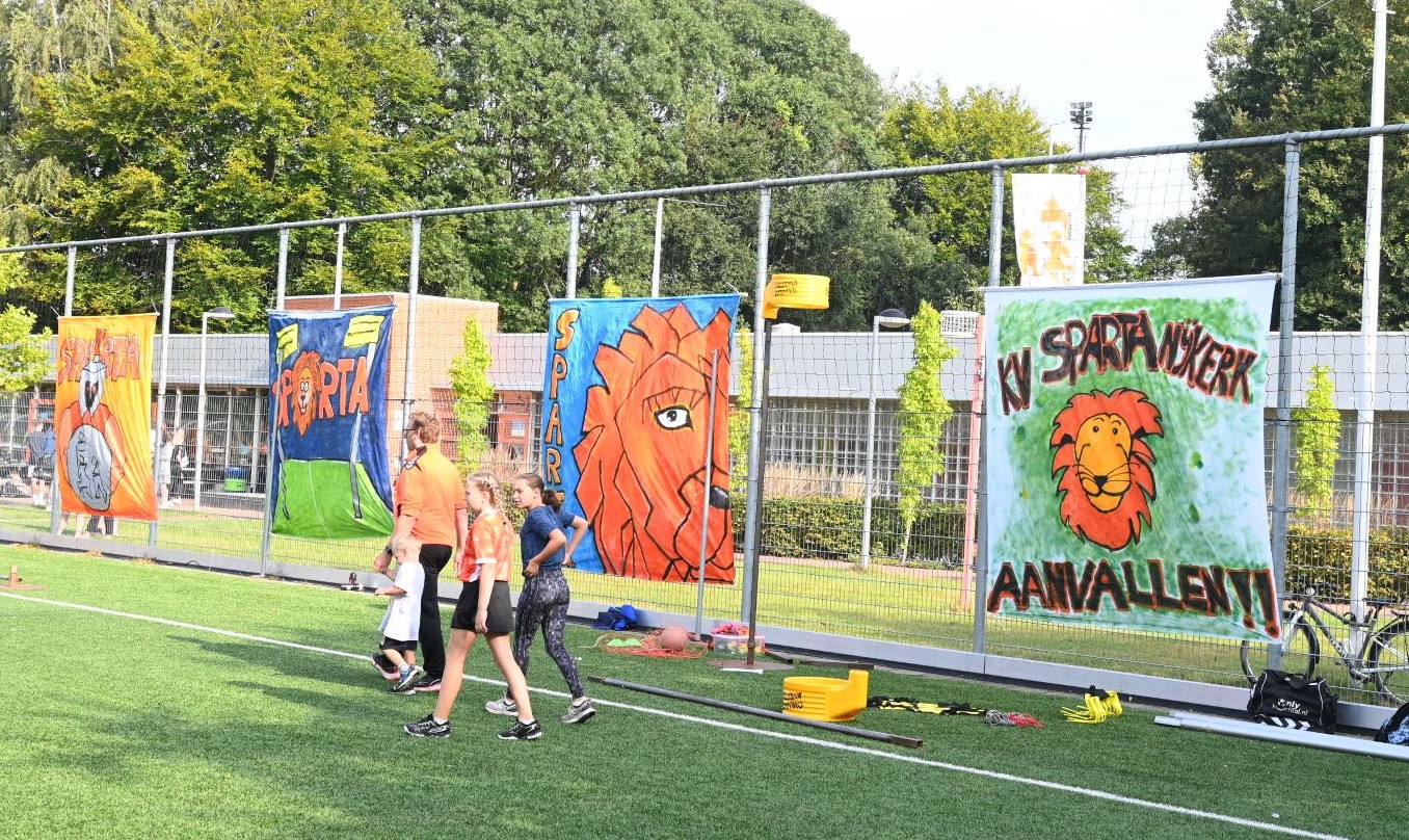 Ook bij Sparta Korfbal is het seizoen weer begonnen. Dat ging zaterdag 31 augustus van start met een clinic van het eerste team. Eerst was er een warming up en daarna nam trainer Brenda Voortman met haar ploeg het stokje over om de jeugd tot en met de D-pupillen de beginselen van de korfbalsport bij te brengen. Ook was er een spandoekenwedstrijd. Foto Kees van den Heuvel