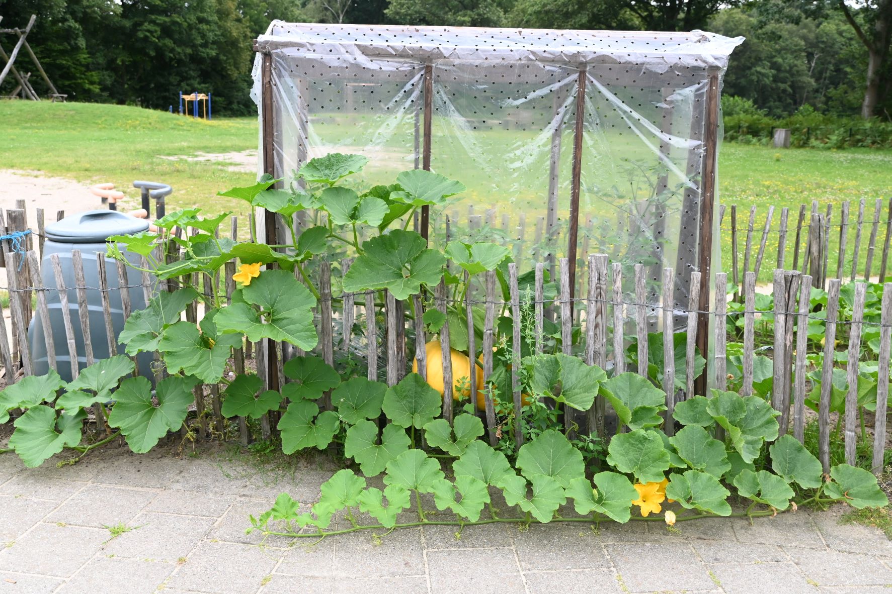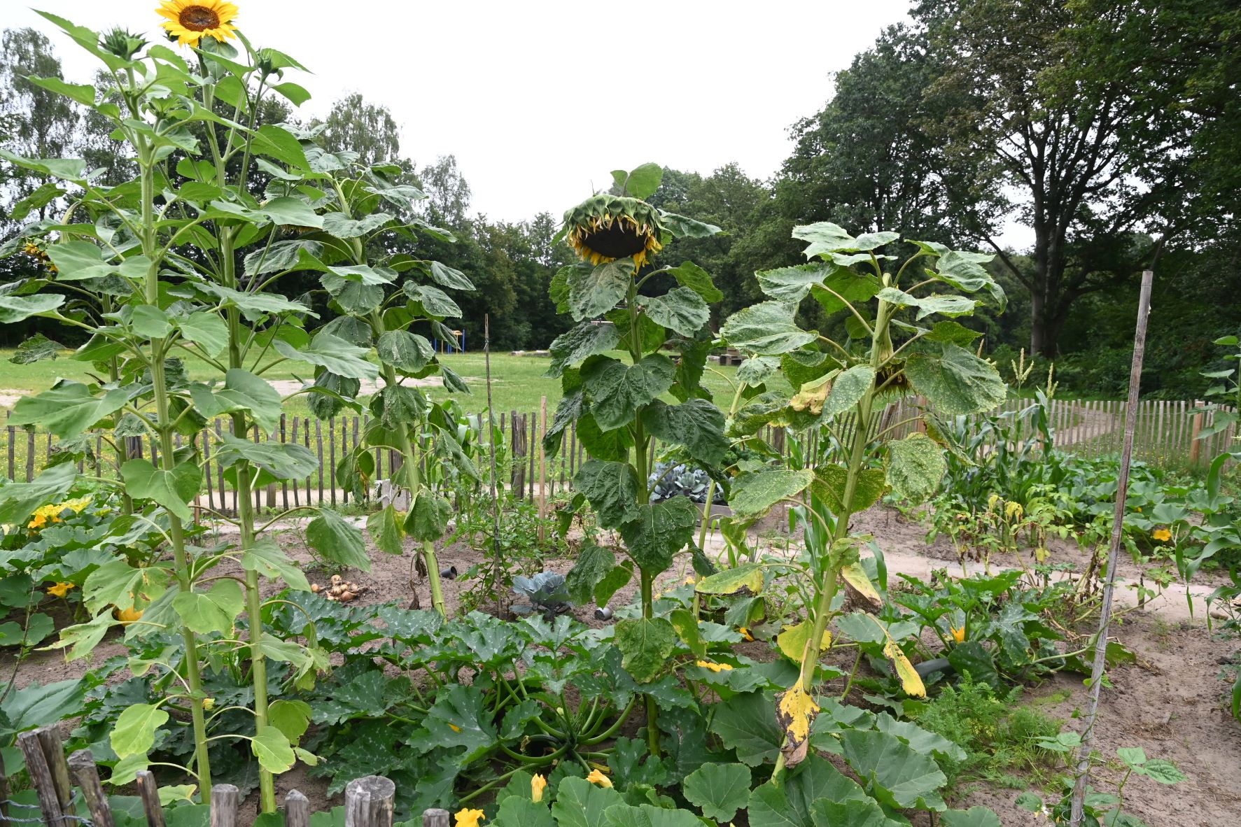 Zonnebloemen horen bij de (na)zomer. Wie vindt ze niet prachtig? Op het schoolplein van De Appelgaard in de Nijkerkse kernen Appel-Driedorp staan de planten al metershoog in volle bloei langs het schoolplein. De leerlingen weten niet wat ze zien als ze straks eind augustus terugkeren op school. Ook liggen er grote kalebassen in de eigen moestuin. Foto Kees van den Heuvel