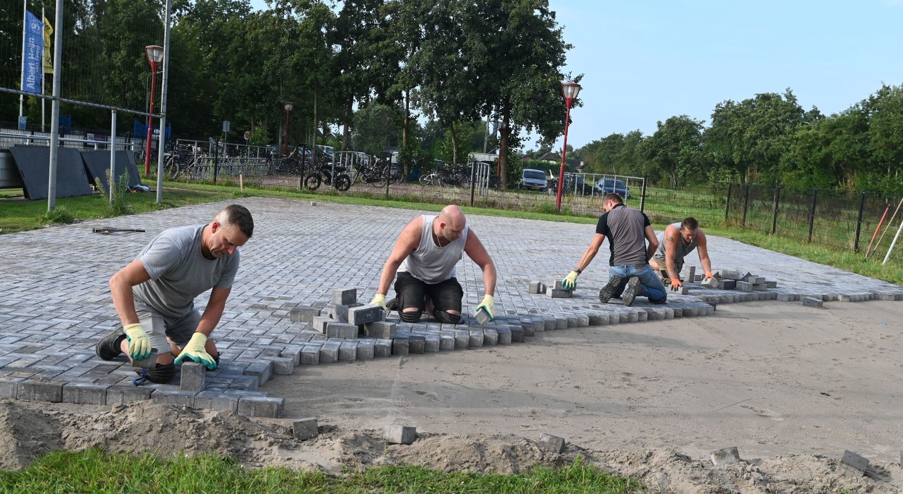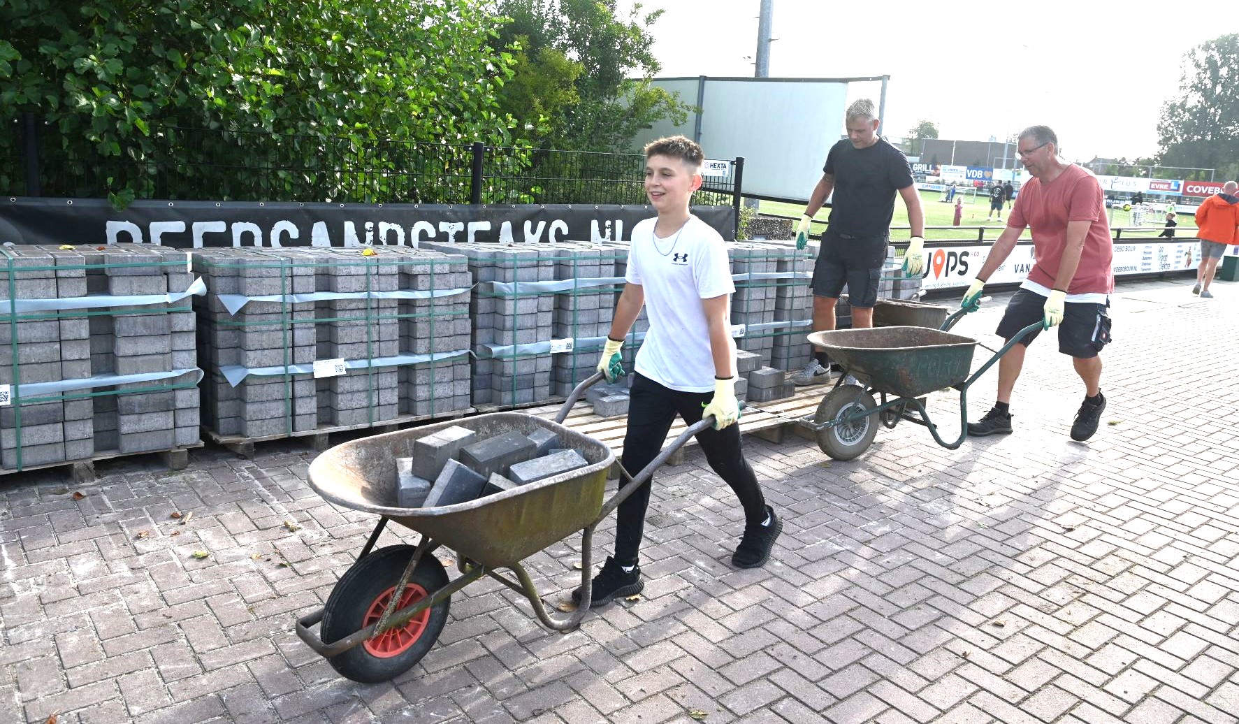 Met vereende krachten heeft Veensche Boys zaterdagmorgen 31 augustus een nieuw pannaveld aangelegd. Het ligt naast het eerste pannaveld, waar doorgaans de kabouters, de jongste klasse van Veensche Boys, oefenen. De stenen voor het pannaveld zijn gesponsord door aannemersbedrijf Bonneveld uit Bunschoten-Spakenburg. Met hulp van vrijwilligers zijn de stenen gelegd. Binnen drie uur tijd lag het veld erin. Foto Kees van den Heuvel